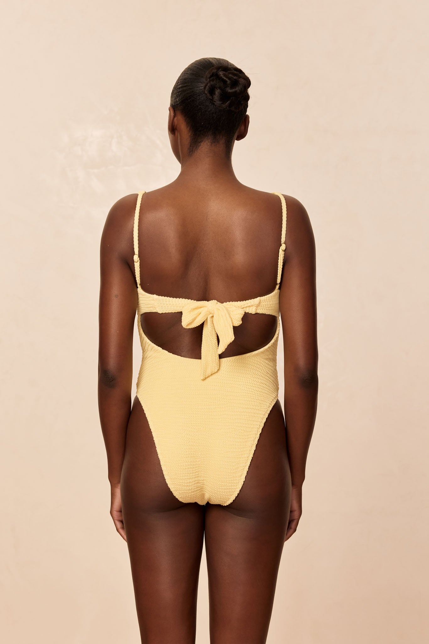 • Back view of plus-size model wearing textured pale yellow one-piece swimsuit with tied bow at back.