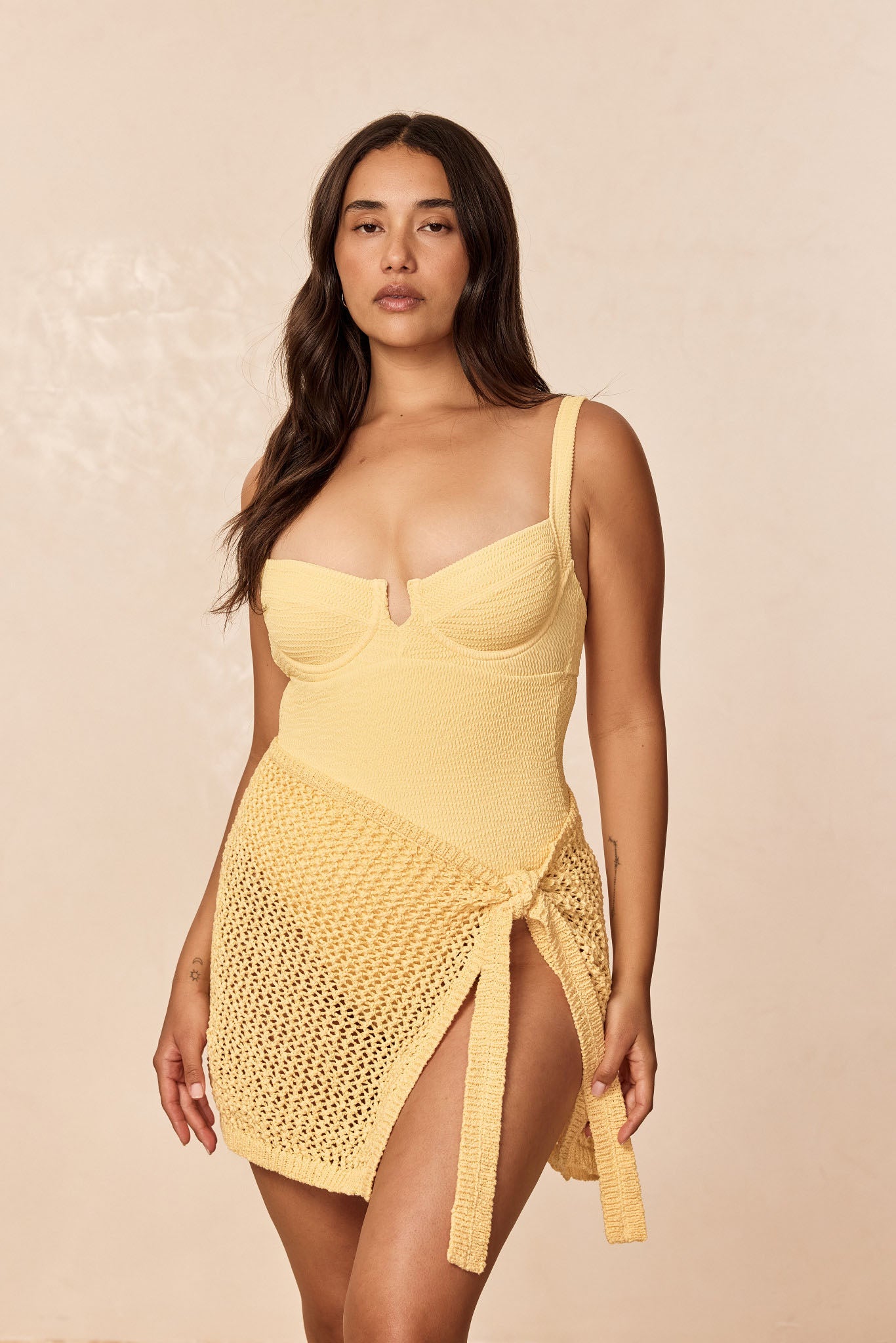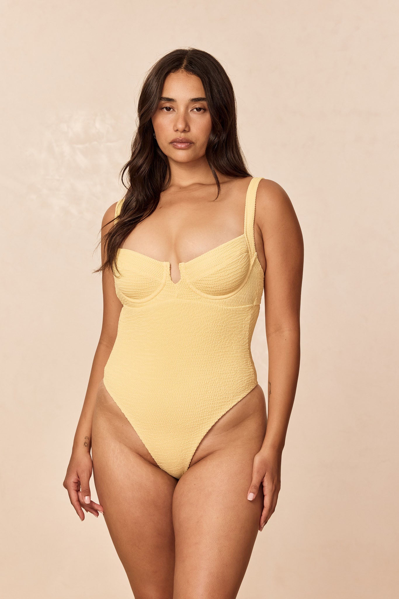 • Plus-size woman in a textured pale-yellow one-piece swimsuit standing facing camera, long wavy dark hair, neutral backdrop