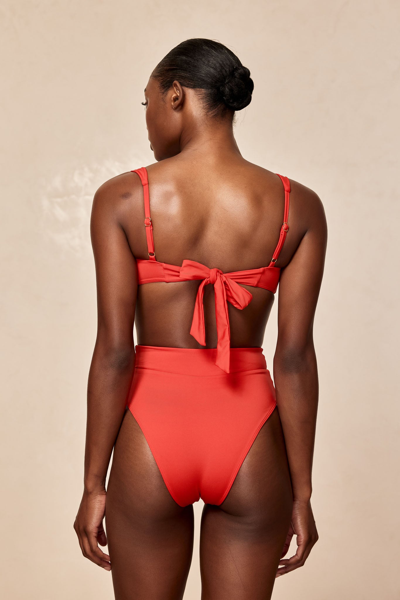 • Red high-waist bikini bottom with a gold circular buckle on the waistband